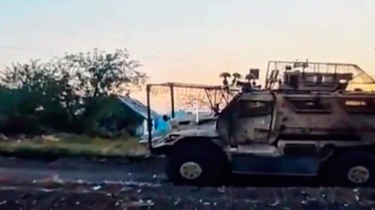 Бронированная боевая машина, следовавшая на высокой скорости по дороге, была остановлена точным ударом FPV-дрона. В результате последующего попадания техника была полностью уничтожена.